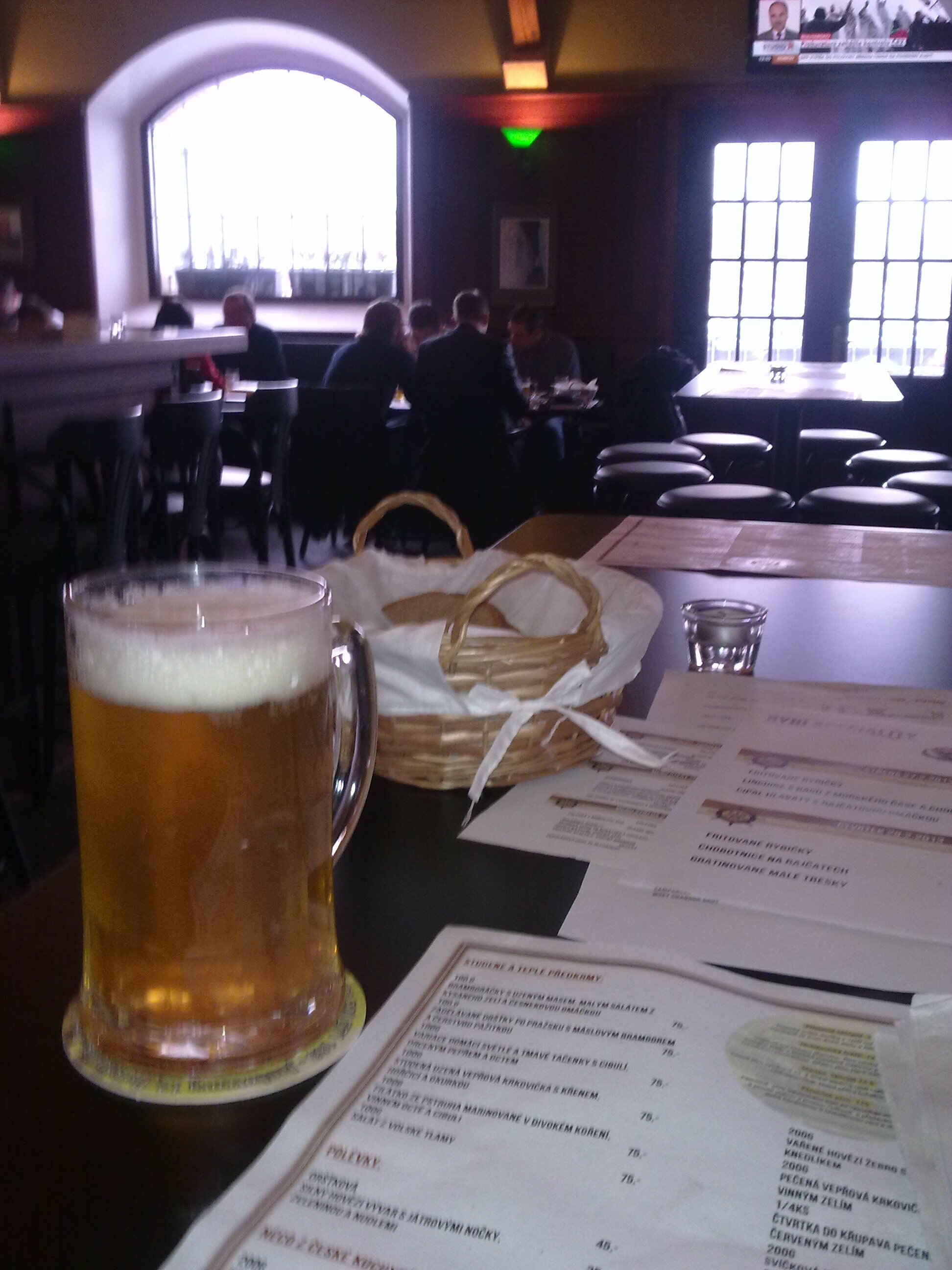 Но есть и несомненные плюсы. Здание очень красивое, посмотрите, фотогалерею на сайте, там не снимали любители с мобильного как я. Внизу не курят, курить можно только на балконах и запах внизу фактически не чувствуется. Под вечер я аж шарахнулся, потому что в зал вошел человек с аккордеоном и начал играть. В девяносто пяти случаев из ста это знак, что заведение туристическое как “У Флеку” или “У Чаши”. Но потом вслушался, мужик играл не только народные песни, но и вещи, которые до сих пор поют под гитару около костра или вот в пивной под конец вечера. То есть заведение всё-таки для местных, пусть по чешским меркам обеспеченных. А сладек молодой, оборудование свежеустановленное, глядишь и научится варить так как его наставник из бржевновского пивовара. Короче, я оптимист.